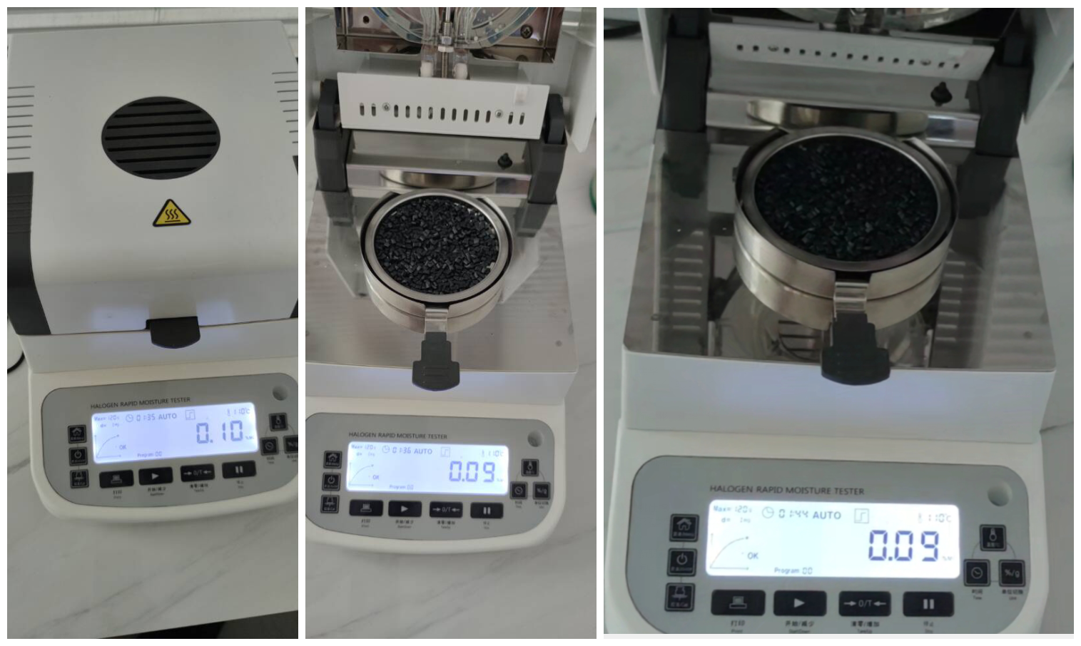 - 復位儀器,待儀器冷卻至40℃以下后,再取15g左右樣品鋪在樣品盤上,重復上述測試步驟;測試結束后得出第三組數據,顯示樣品的水分含量為0.09%;數據基本相同,排除了一、二組測試的小概率巧合,確認測定結果準確。