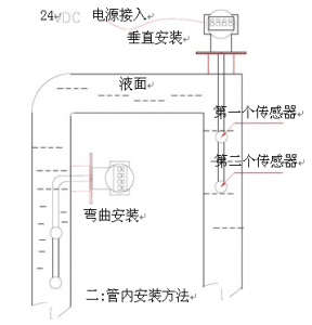 2: 現(xiàn)場(chǎng)液體必須保持沒(méi)過(guò)兩個(gè)測(cè)量傳感器,法蘭到第一個(gè)傳感器的距離可選.